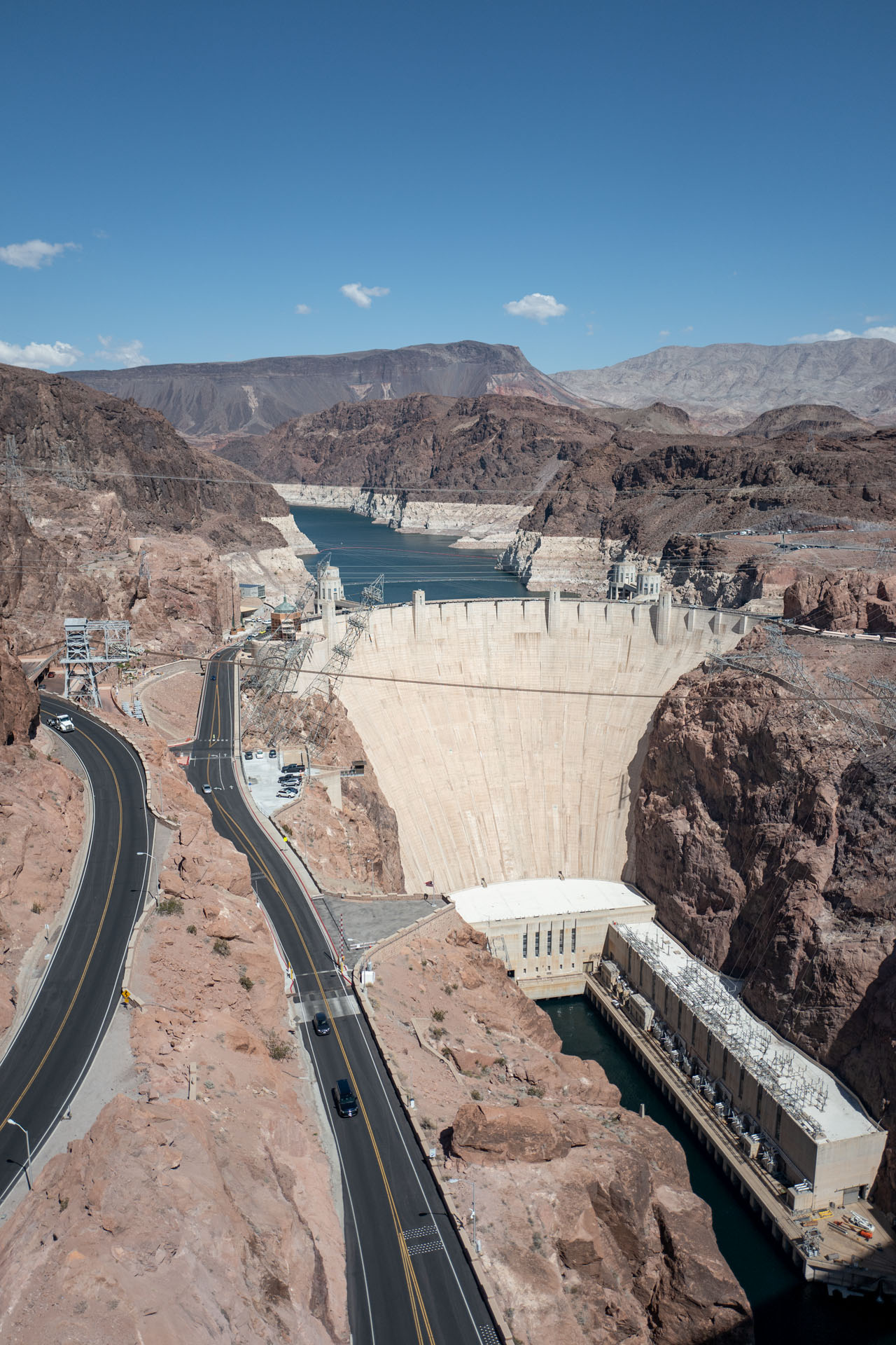 On the way to the dam, the landscape becomes increasingly barren. And just like back then, the wind is quite strong and unpleasantly warm. First we stop at the parking lot west of the dam to walk to the “new” Mike O'Callagan Pat Tillman Memorial Bridge. Here we have to hold on to our hats, as the wind is now really strong. The view of the dam is fantastic, but also requires some effort, as it is 270 m down. We then drive over the dam once and park directly behind it to walk across the dam. Even if it doesn't seem too far, you should take enough to drink and apply sunscreen, because the sun burns relentlessly. When you cross the dam, you also cross the border from Nevada to Arizona and thus also a time zone.
