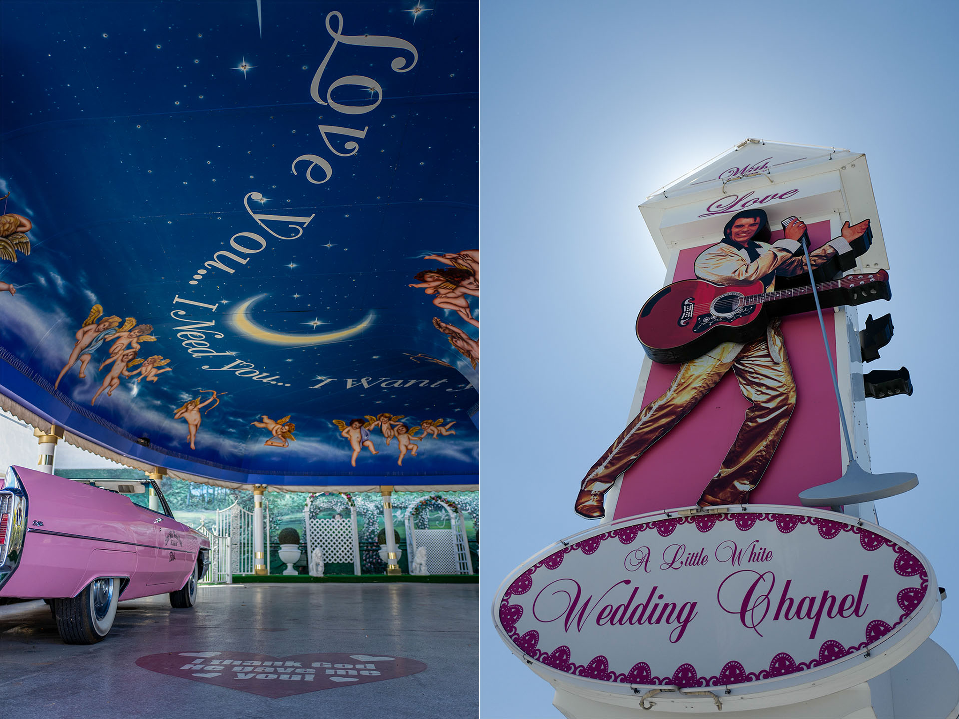To get another view of Las Vegas from above and take in the scale of the city, we drive to the Stratosphere Tower. On the way there, we stop briefly at a typical Elvis wedding chapel - just for a photo.