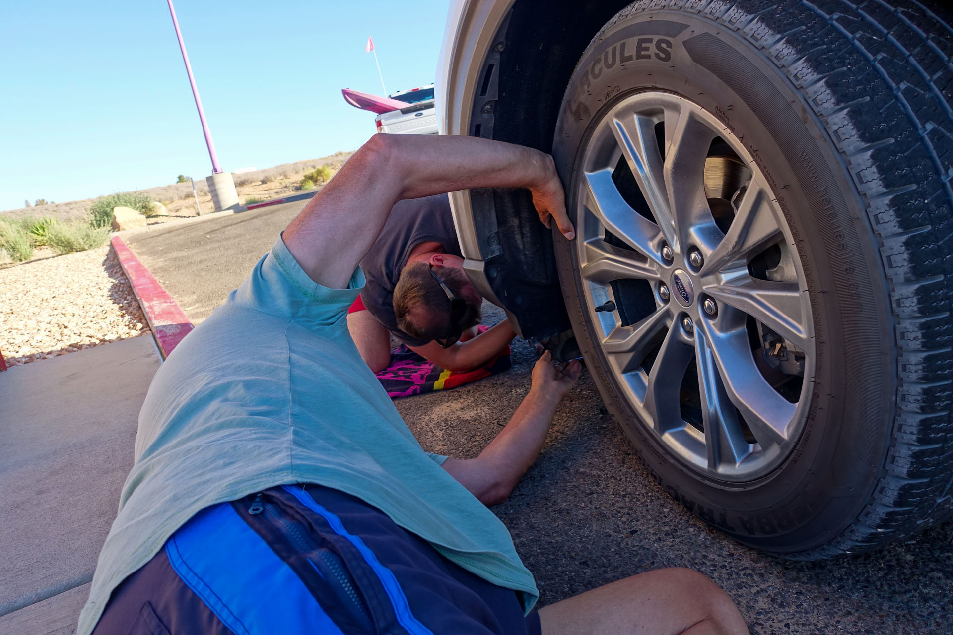 However, when we arrive at the gas station, we see while pumping air that the underride guard is hanging down completely. We decide to unscrew it completely. Luckily I have a multitool with me, which also has a pair of pliers. So it's done after a few minutes.