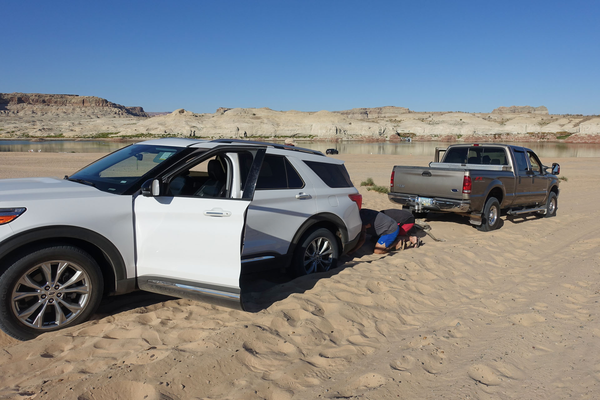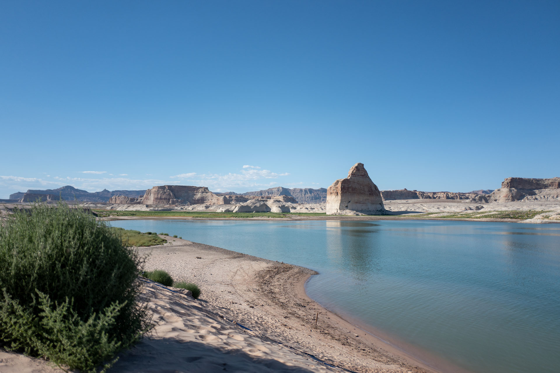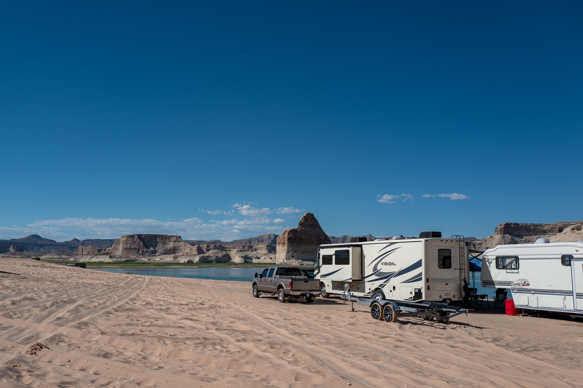 It's now 4 p.m. and after the hot and dusty fun, we plan a trip to Lake Powell, more precisely to Lone Rock Beach. In theory, you can drive your car right down to the water. But this is not as easy as said, since it is a sandy beach and there are only a few lanes on which you should move. So we drive as far as we dare to get to the water, grab a few towels and refresh ourselves in the lake. Somehow others have found a way to get to the shore with their huge mobile home or trailer. Typically American, they also have everything you need for fun - canoes, jet skis, beach buggies, etc.