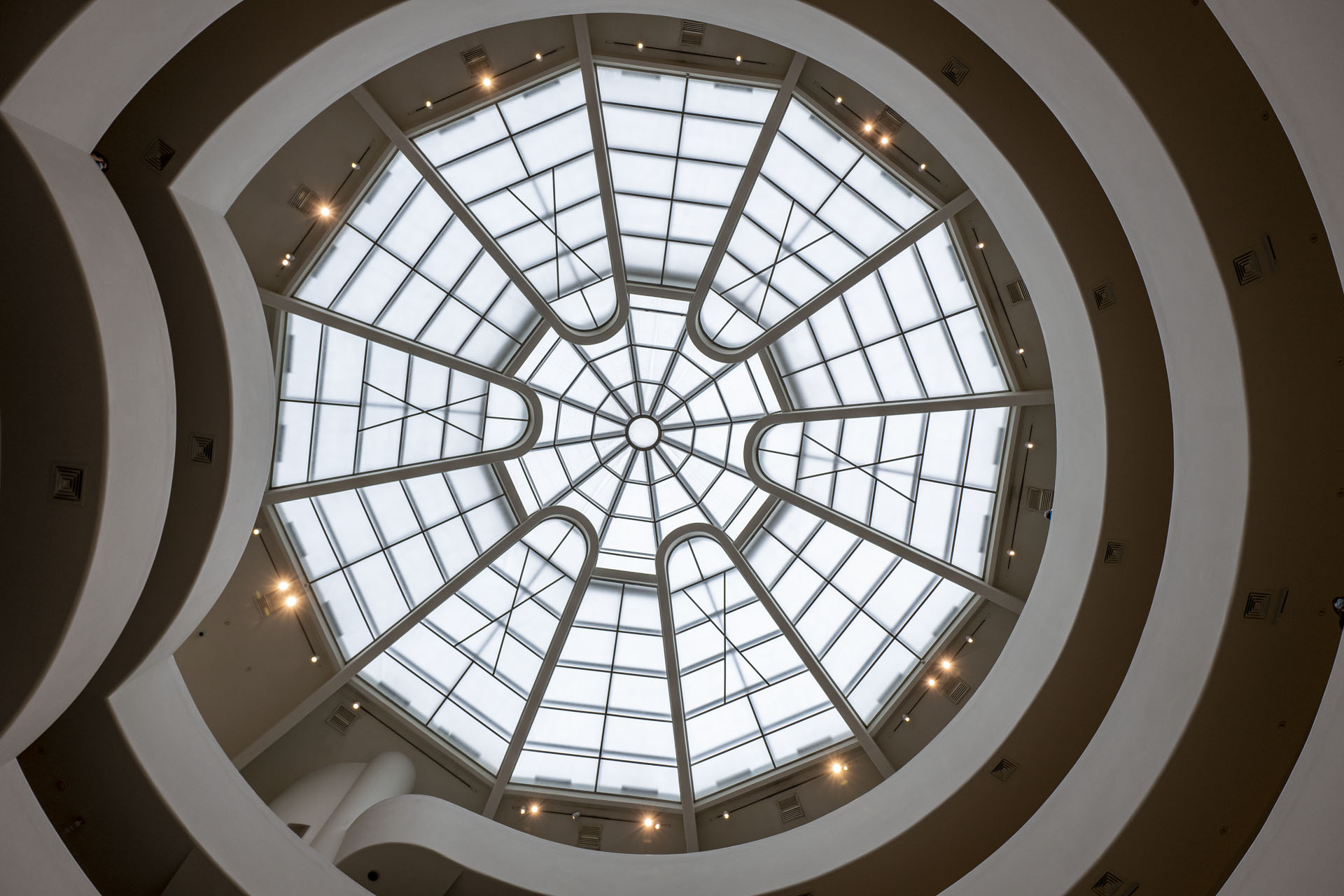 Now we take the bus and drive to the Guggenheim Museum. Because of the limited time, we only have a brief look at the entrance area with the spiral staircase and the large glass window under the roof.