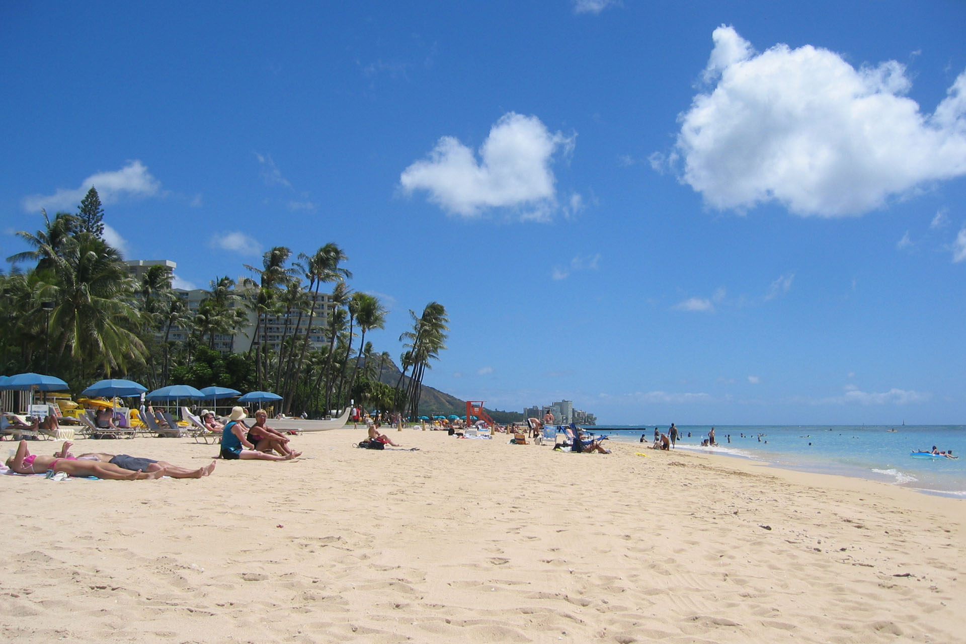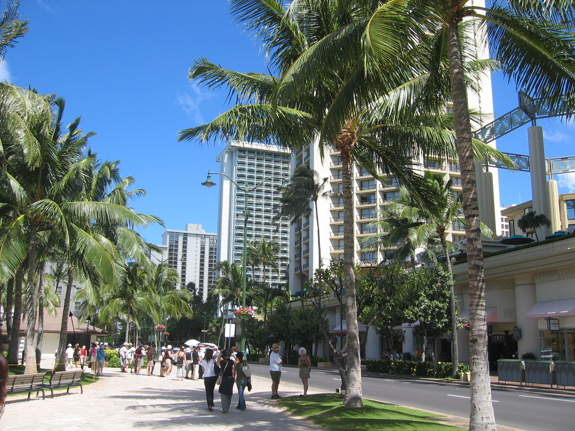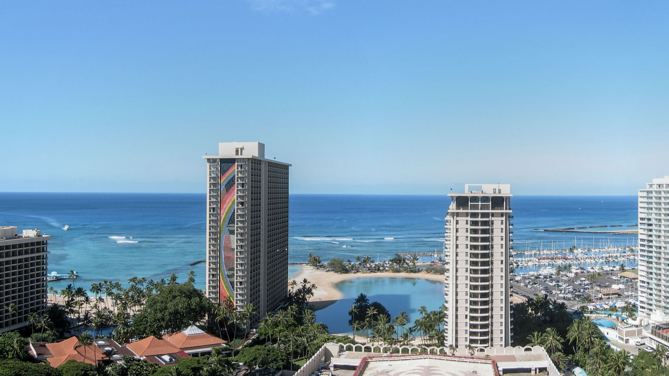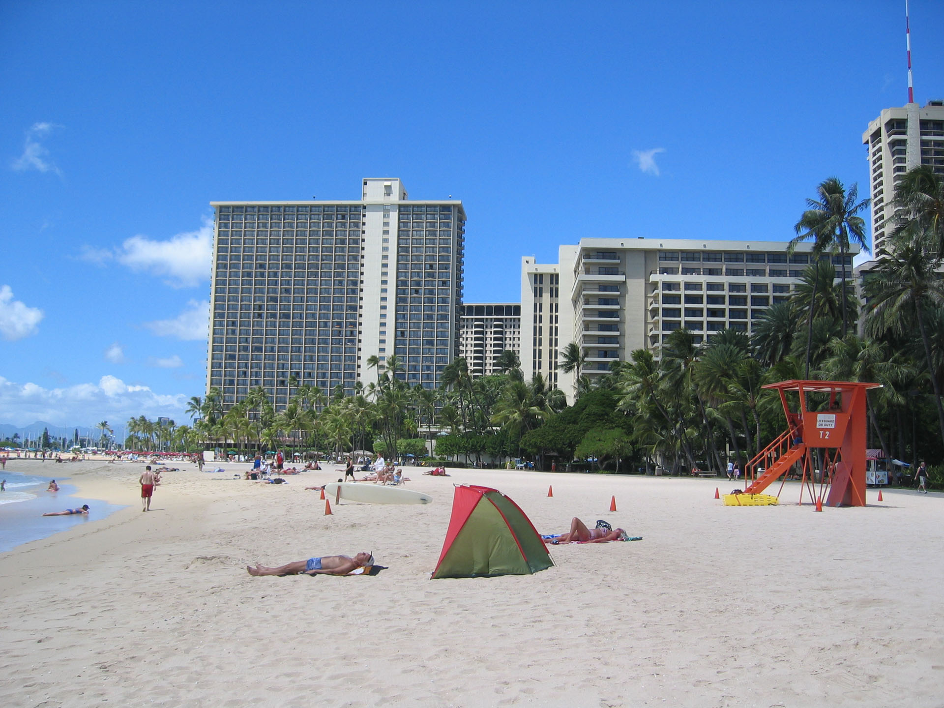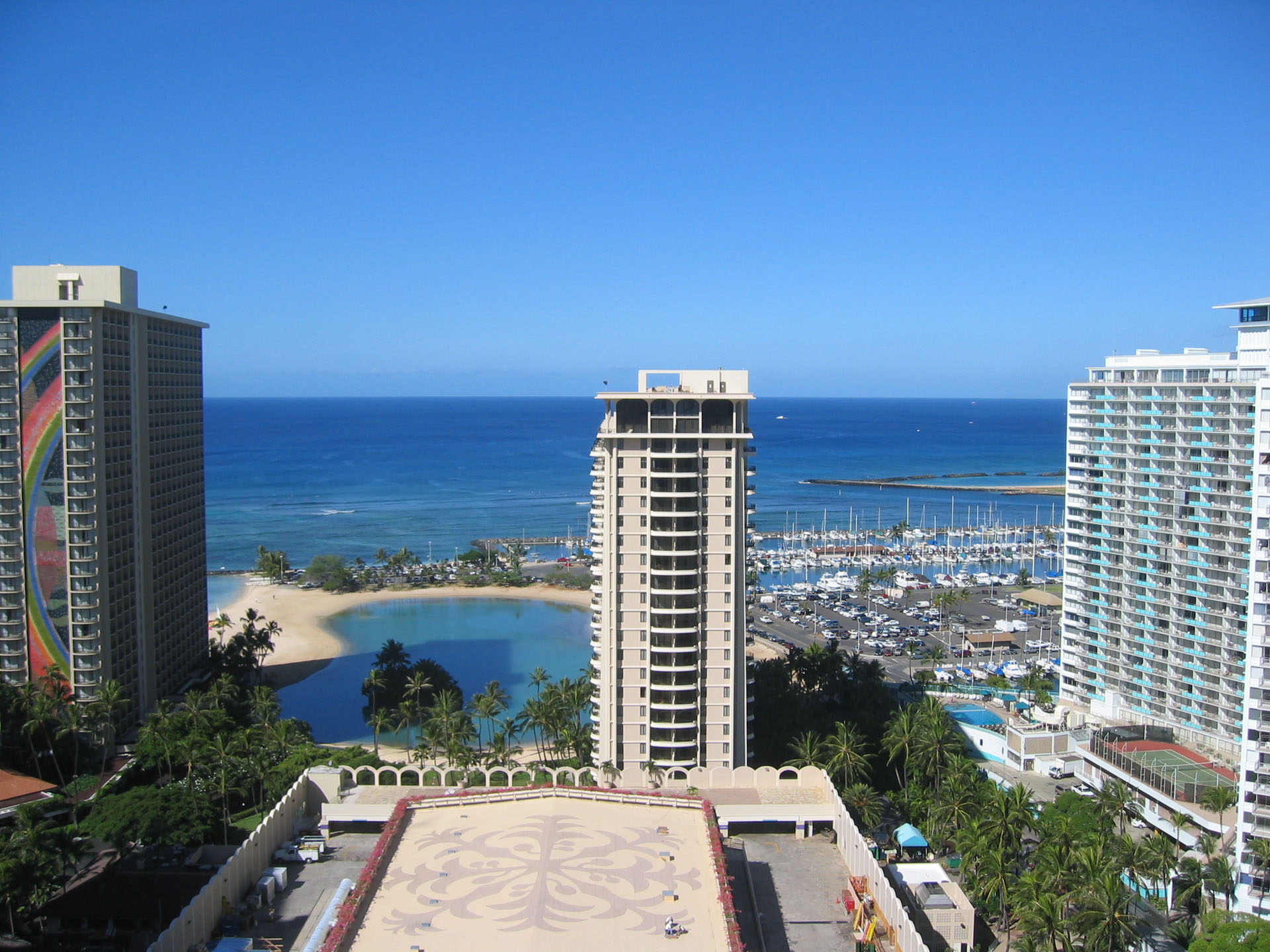 Gegen 16 Uhr haben wir unseren schicken roten Kleinwagen und fahren Richtung Waikiki Beach zum Hotel. Gegen 16.30 Uhr sind wir im Hotel Hilton Hawaiian Village, checken mit Hilfe einer Hotelangestellten an einem neuen elektronischen Schalter ein. Es stellt sich heraus, dass dieser elektronische Check-in-Schalter eine Neuerung im Hotel ist, darum bekommt auch jeder Gast erst mal eine persönliche Unterstützung und muss zum Schluss zwei Fragen beantworten, wie er das elektronische System findet. Wir finden es beide doof, auch wenn es technisch gut umgesetzt ist. Ein menschliches Wesen beim Empfang ist einfach nicht zu ersetzen. Unverständlich ist der Schritt der Nutzung eines solchen technischen Terminals hier in Amerika in unseren Augen sowieso, da wir den Eindruck haben, dass das Personal hier zugegen regelrecht „verschwendet“ wird. Beispiele dafür sind derer mehrere zu finden: Lebende Stopp- und Fahrtschilder an Baustellen, Einweiser in Parkhäuser auch noch spät in der Nacht, Einkaufsverpacker in Kaufhäusern, etc. . Egal, wir müssen nicht alles verstehen… Als auf dem Ausdruck für das zugewiesene Zimmer "Oceanview" steht, sind wir eh wieder glücklich, da wir aufgrund des viel geringeren Preises Park View gewählt hatten (Aufpreis Oceanview: 50 EUR pro Nacht und Person).