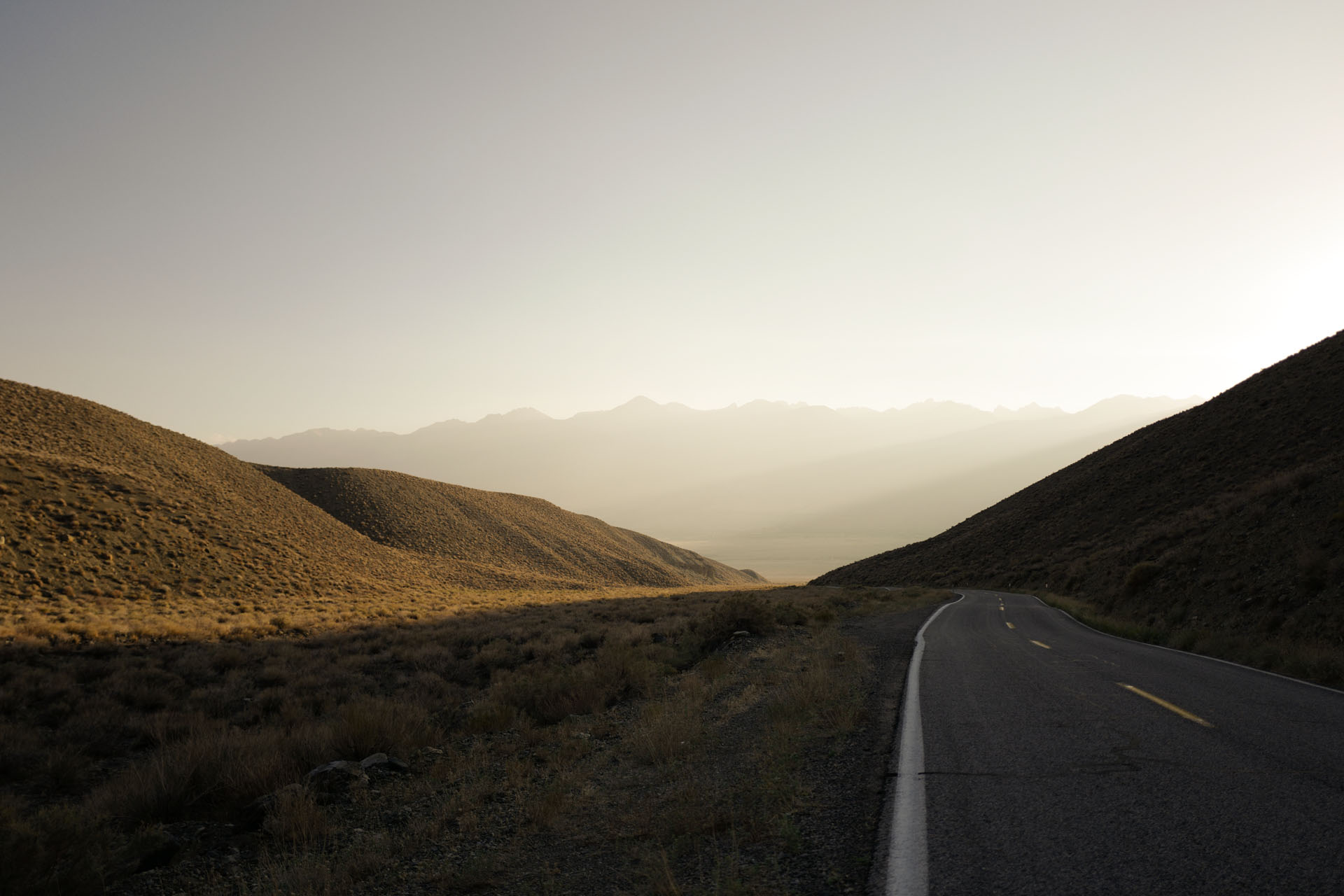 Mit dem Überqueren der letzte Bergkette vor Bishop, wird es langsam wieder etwas grüner und es sieht nicht mehr ganz so trocken aus. Zu der Zeit steht die Sonne schon sehr tief und taucht damit die Landschaft in ein schönes warmes Licht.