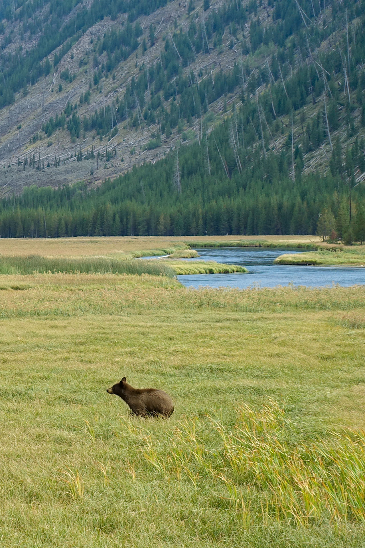 Langsam neigt sich nun der Tag schon dem Ende. Wir haben noch ca. 80 km vor uns, bis zu unserem Hotel in West Yellowstone. Wir halten dabei natürlich immer Ausschau nach weiteren Tiere und ein paar Kilometer vor dem westlichen Parkausgang, staut sich plötzlich der Verkehr. Das deute immer daraufhin, dass sich Tiere in der Nähe sehen lassen. Wir halten glücklicherweise direkt an einer freien Parkbucht und haben das Glück, auf der anderen Seite des Flusses eine Bären zu entdecken. Dieser lässt sich von den vielen Beobachter überhaupt nicht stören und ist energisch dabei, alle Früchte eines großen Strauches zu vernaschen. Das geht soweit, dass er mit ganzen Körpereinsatz den kompletten Strauch umknickt.