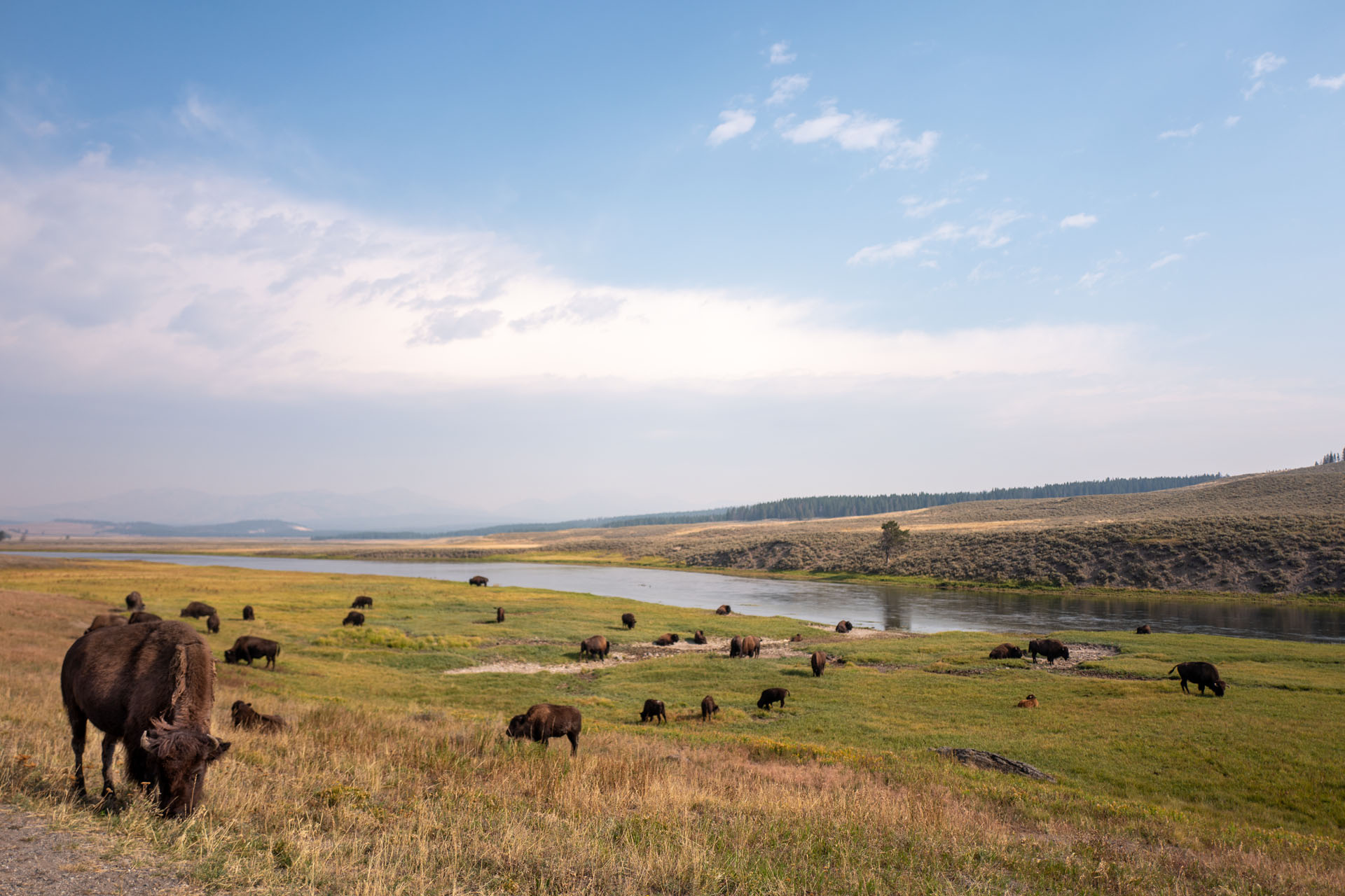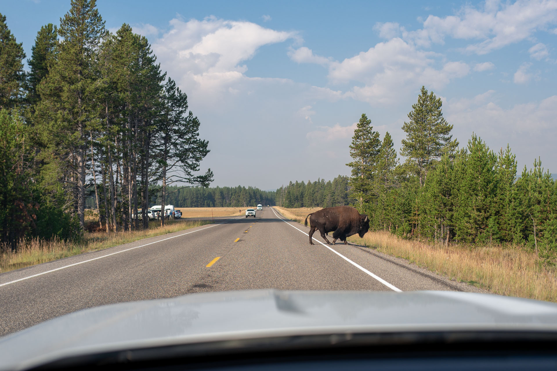 Unsere erste Begegnung mit einem Bison haben wir dann ein paar Minuten später. Direkt vor uns überquert er ganz gemütlich die Straße und lässt dabei keinen Zweifel aufkommen, dass er der Chef hier ist. Kurz darauf treffen wir auf eine ganze Herde direkt am Straßenrand. Das führt auch gleich zu einem kleinen Stau, weil natürlich alle aussteigen um Fotos zu machen. Die Tiere wirken insgesamt sehr entspannt und sind wohl an die vielen Besucher gewöhnt. Dennoch wird bei Anblicke der ausgewachsenen Bullen auch klar, im Notfall möchte man ihnen nicht im Wege stehen aufgrund ihrer puren Masse. Also haltet bitte Abstand.