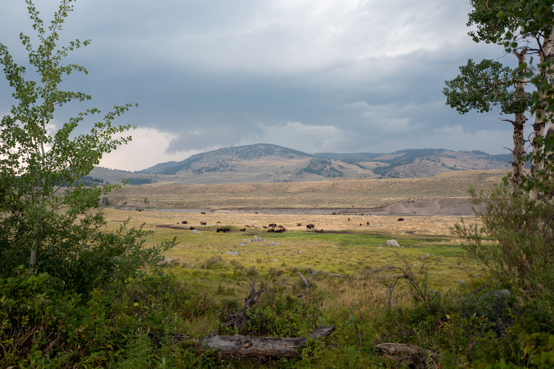 Wir checken also kurz die Wettersituation und entscheiden uns in Richtung Lamar Valley zu fahren. Im Lamar Valley soll die Chance am größten sein, die verschiedenste, im Yellowstone lebenden Tiere (Bisons, Wapitis, Wölfe und Bären) zu sehen. Leider ist das Lamar Valley wegen Überflutung seit einigen Wochen schon gesperrt und wir können nur ein paar Meilen hineinfahren. Wir stoppen immer wieder mal und sichten neben weiteren Bisons ein paar hirschartige Tiere.