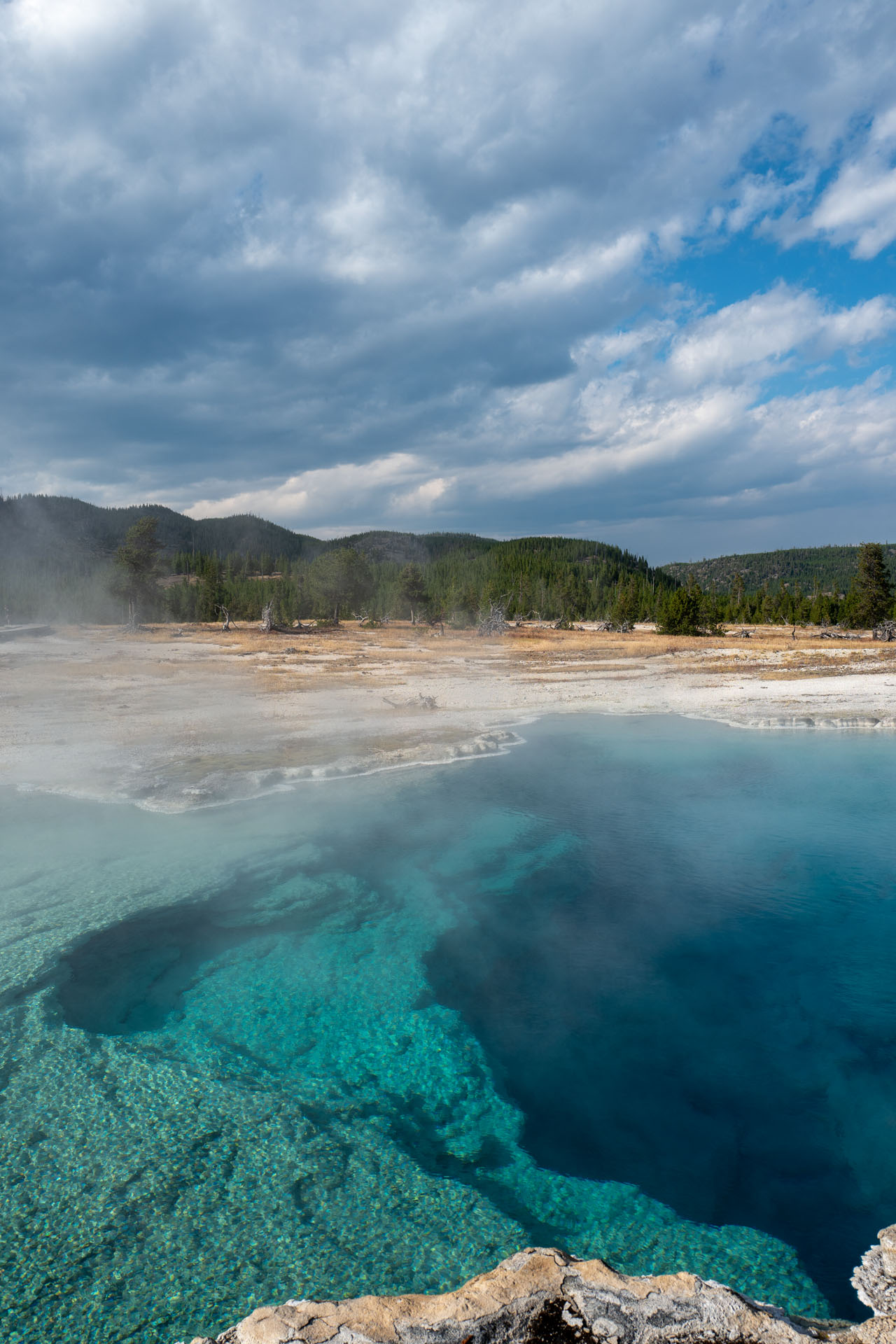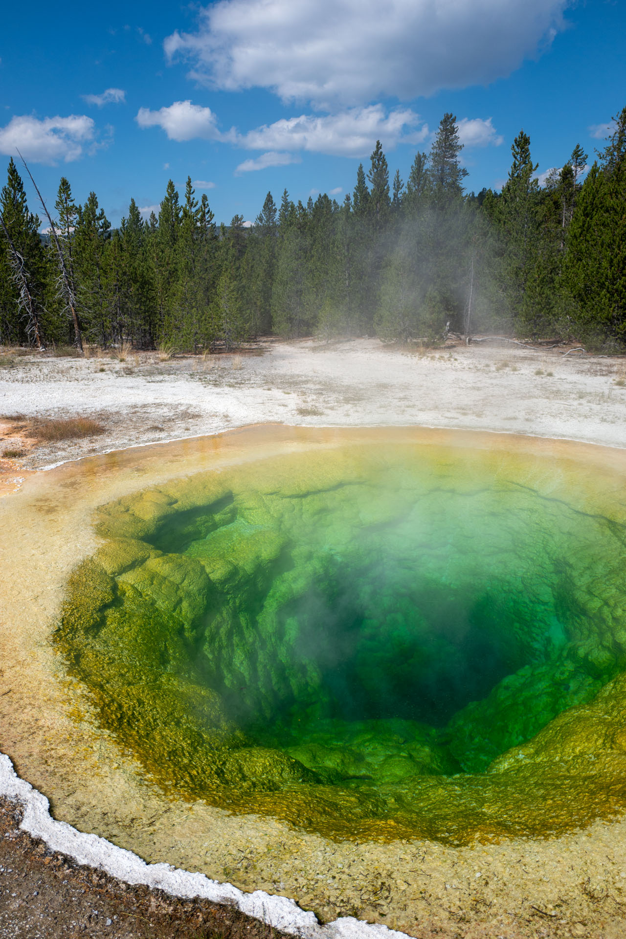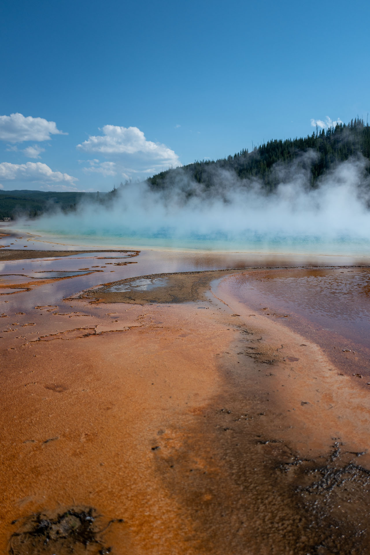Besonders die Basins sind sehr farbenfroh, was durch darin lebende Bakterien hervorgerufen wird. Obwohl das alles sehr einladend aussieht, wird auf mehreren Schildern eindringlichst davor gewarnt, die Holzstege zu verlassen. Denn das Wasser ist extrem heiß und teilweise extrem säurehaltig. Es besteht also absolute Lebensgefahr. Interessanter weise finden man aber immer wieder mal ein paar Hufspuren auf dem Boden. Die Bisons wissen offensichtlich, wo man hintreten muss ^^
