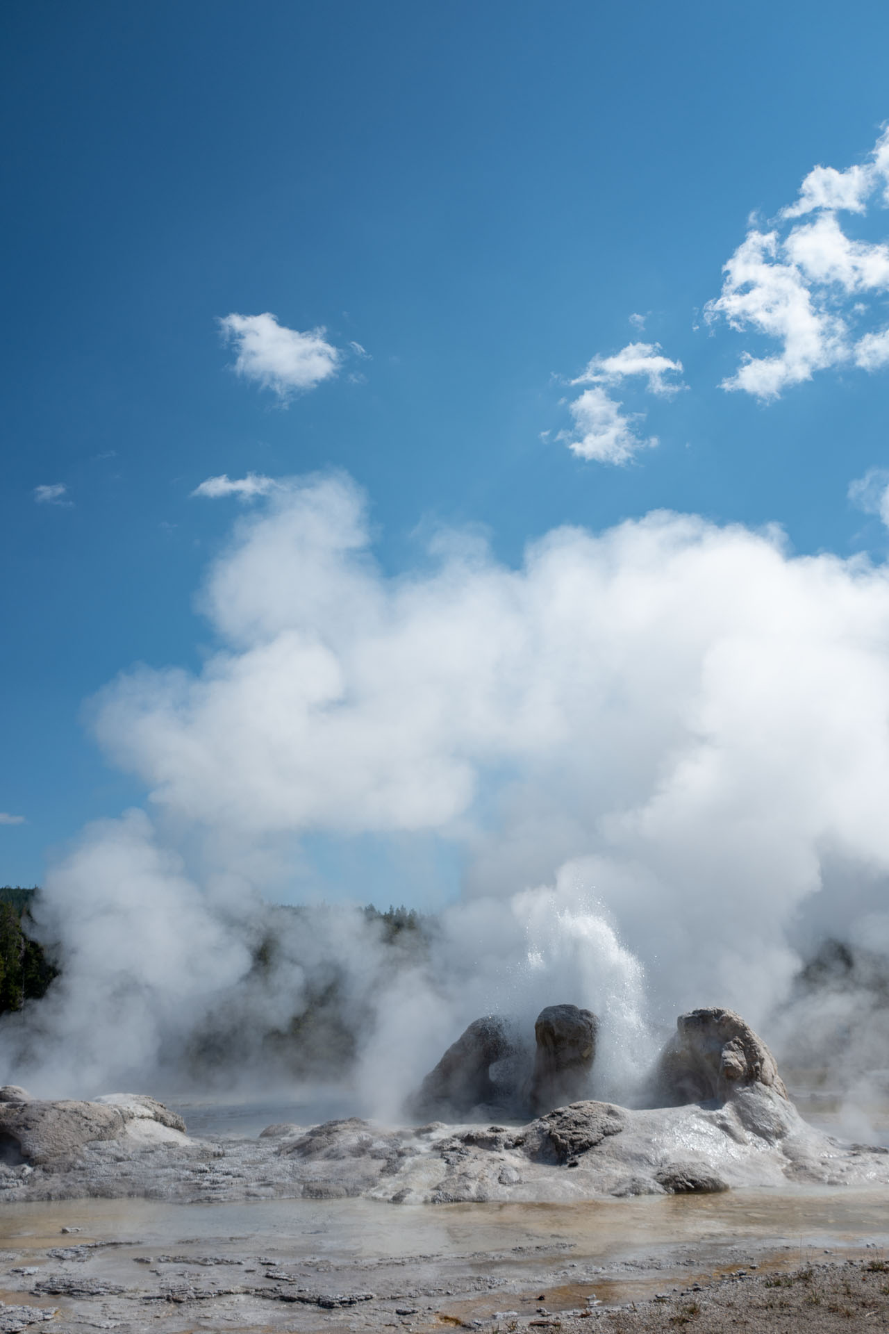 Heute schauen wir uns die Geysire und heißen Quellen an. Wir starten natürlich mit dem Old Faithful. Dieser spukt regelmäßig (alle 60-120min) tausende Liter heißen Wassers aus. Die dabei entstehende Fontaine wird im Schnitt ca. 40 m hoch und von viel heißen Wasserdampf begleitet. Das ganze Schauspiel dauerte in unserem Fall etwas mehr als 4 min.