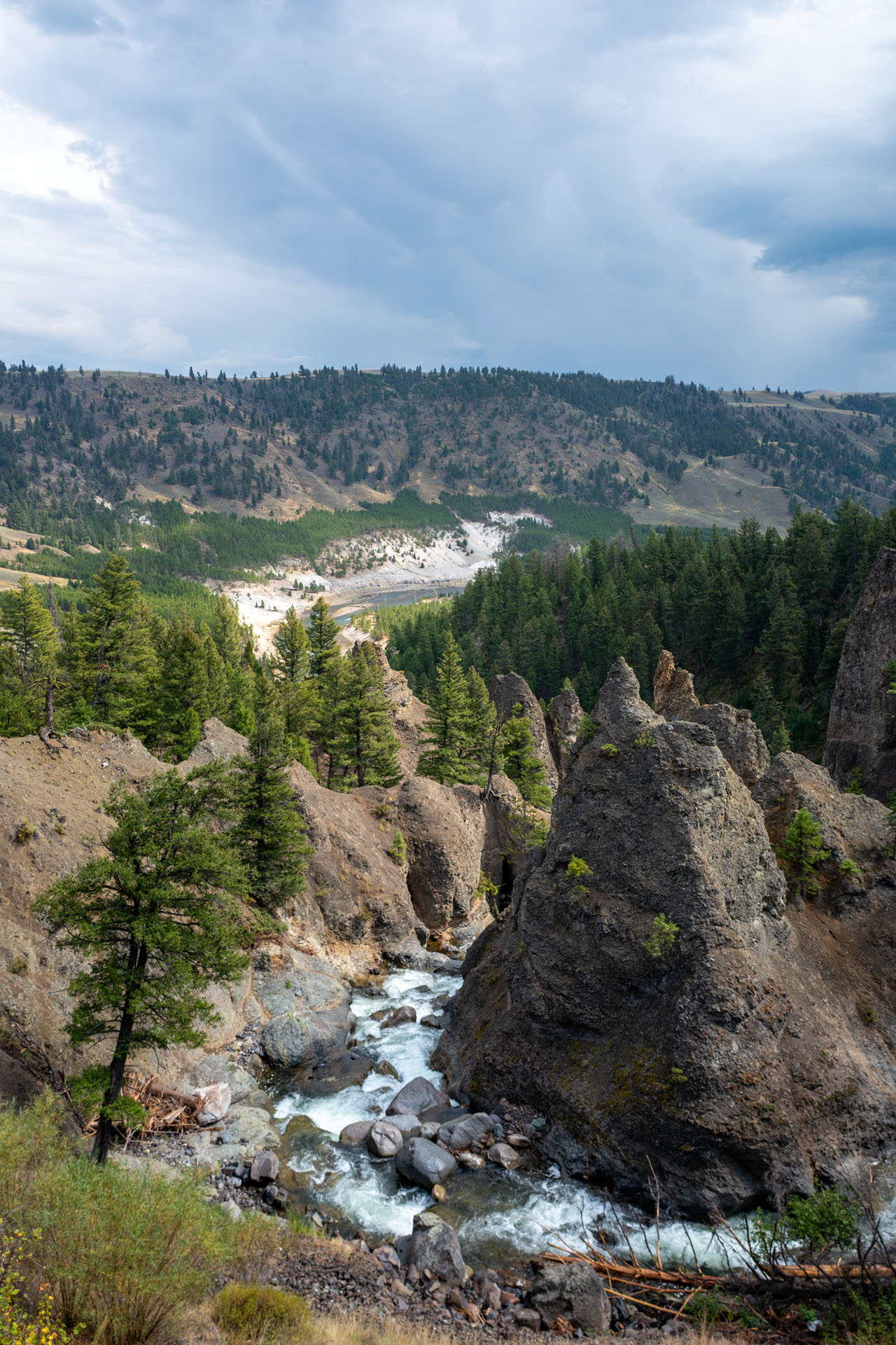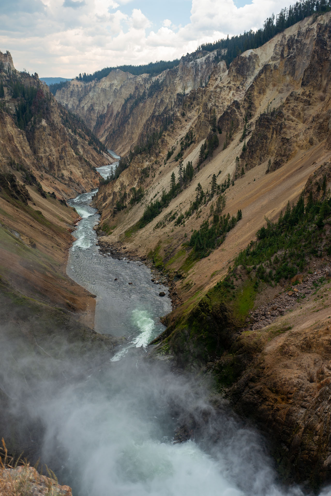Nach einem kurzen Frühstückssnack geht es gemeinsam zu den Wasserfällen des Yellowstone Rivers, welche nur ein paar Minuten entfernt sind. Das Wetter weiß noch nicht so richtig, was es will und als wir an den Lower Falls angekommen sind, wird es plötzlich sehr windig und dicke Regenwolken ziehen auf. Wir genießen noch kurz die Aussicht über den "Grand Canyon" des Yellowstones und machen uns dann schnellen Schrittes wieder zurück zu den Autos. Von gegenüber hören wir dabei schon, wie vereinzelt Bäume umknicken, was die Situation nicht grad angenehmer macht. Kurz bevor wir die Autos erreichen, fängt es ordentlich an zu regnen und wir werden einmal gut nass.