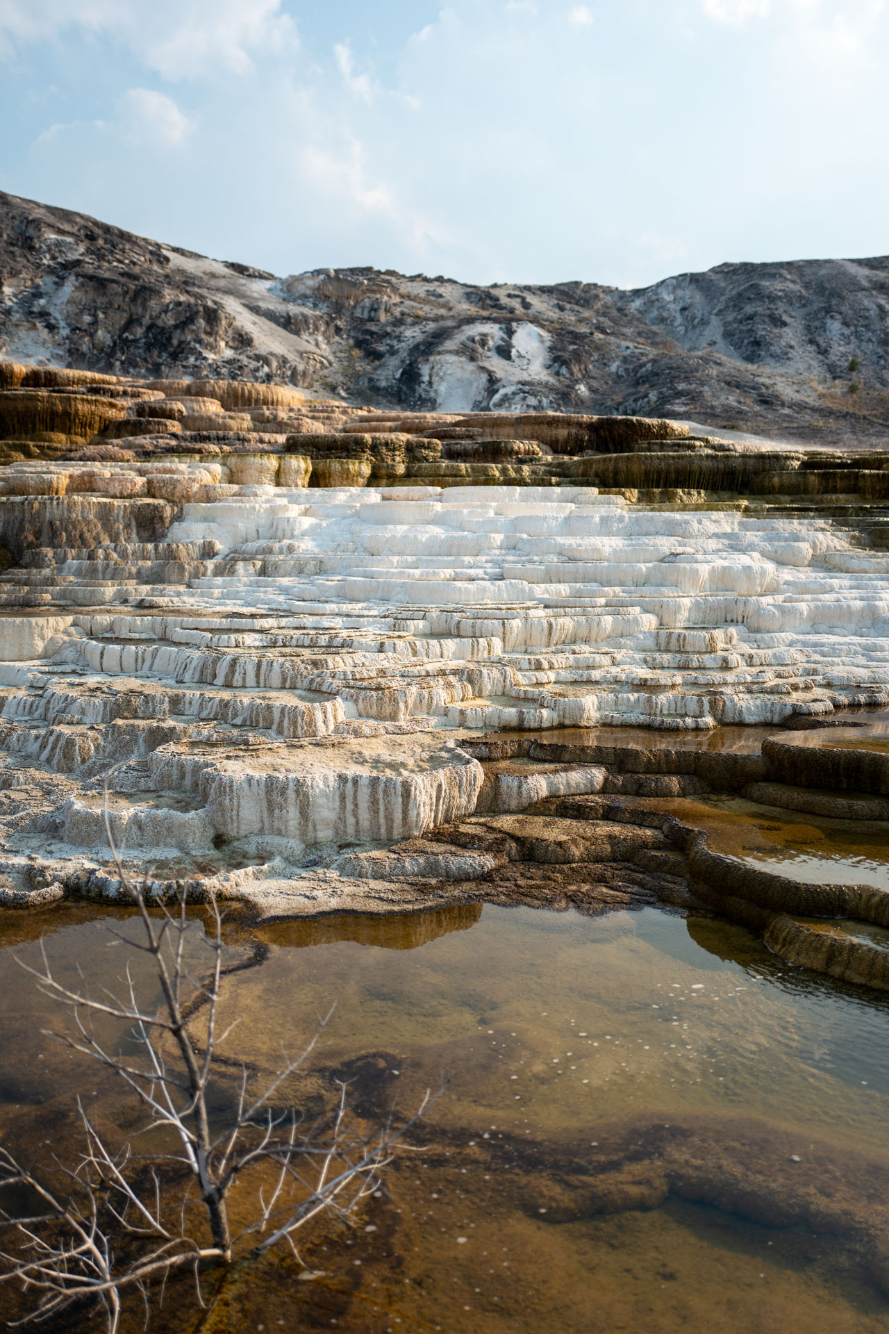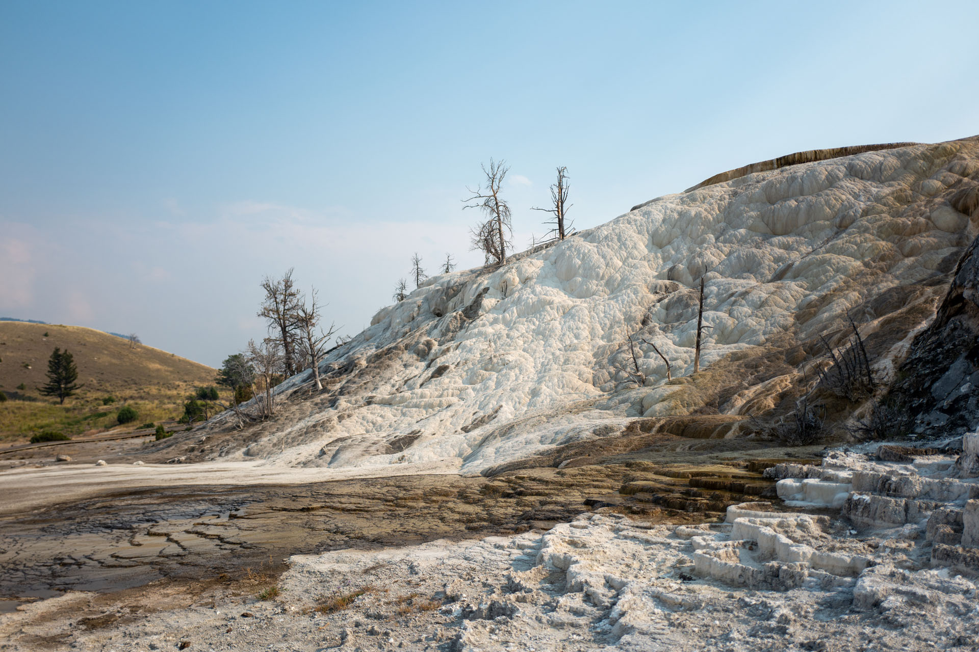 Nachdem wir nun alles etwas gestärkt sind, geht es hinüber zu den Sinterterrassen. Dies sind Kalksteinterrassen, welche durch aufsteigendes heißes Wasser (bis zu 70°C) entstehen, welches sehr mineral- und kalkhaltig ist. Es ist das gleichen Entstehungsprinzip, wie Pamukkale in der Türkei. Auf Holzstegen kann man über und durch die Terrassen laufen und die bizarren Formen erkunden. Dabei kommt man immer wieder in den Genuss des Schwefelgeruches, der beim Austreten der Quellen entsteht.